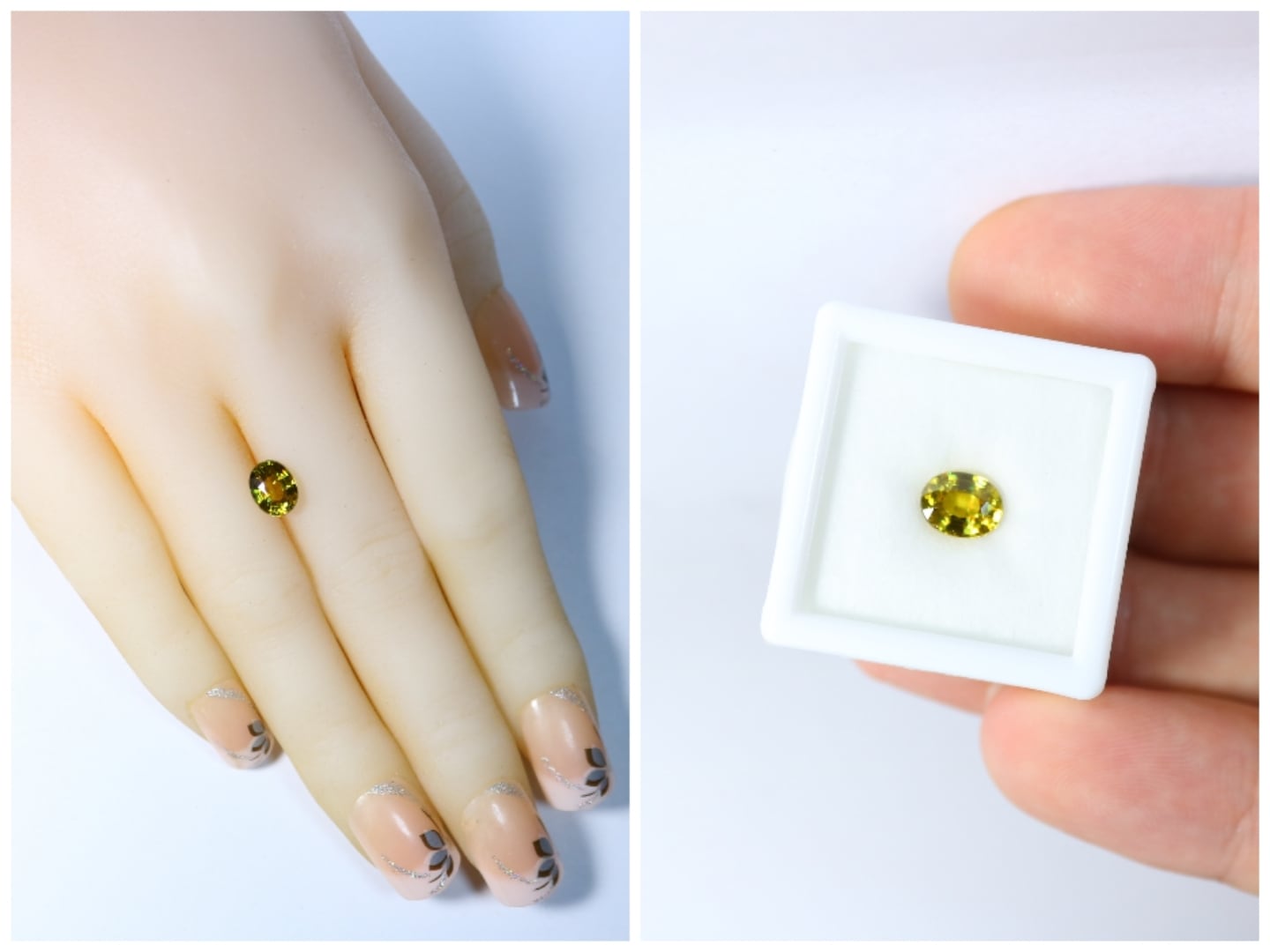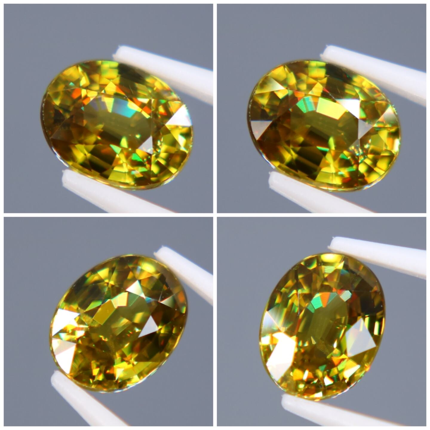 カットは全体的にバランスの良いオーバルカットで、スフェーンならではのギラギラした輝きを放ちます。