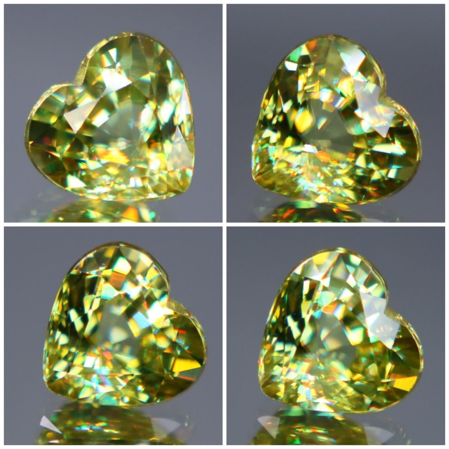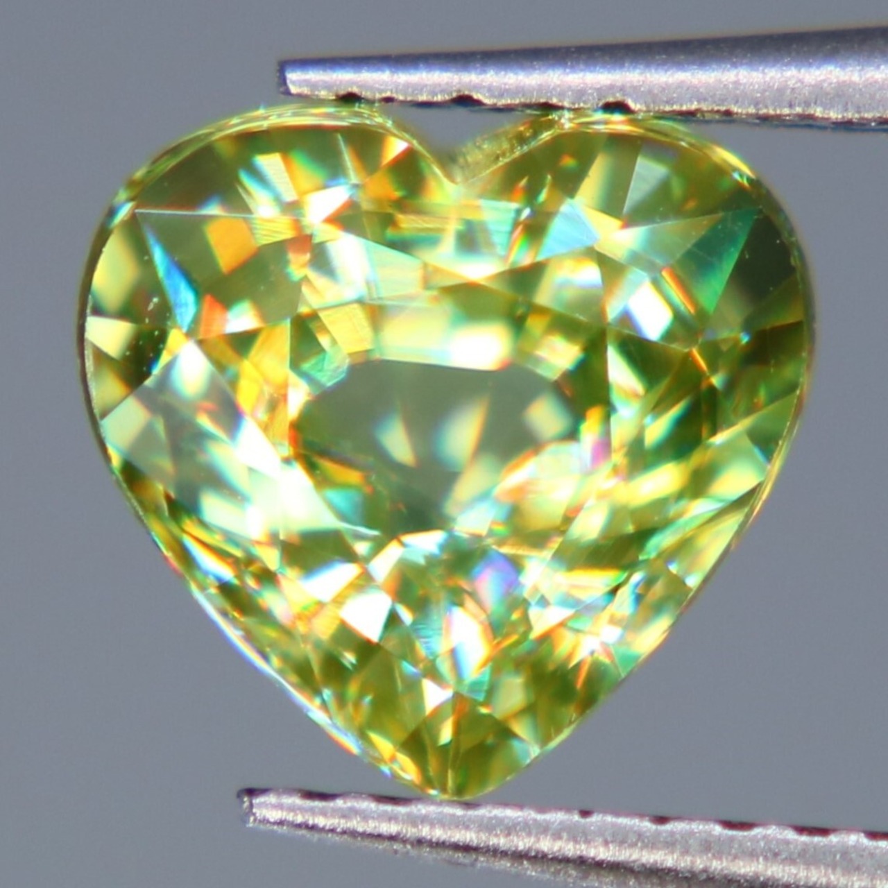 また、光の屈折率と分散度が非常に高く、ダイヤモンドのように虹色の光を輝かせることで人気の宝石です。